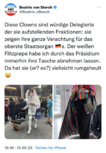 Mit ihrer Äußerung hat von Storch die Abgeordnete Tessa Ganserer schwer attackiert und sie in ihre Ehre verletzt. Sie spricht mehrfach von einer „Ideologie“, lehnt die Geschlechtsidentität von Tessa Ganserer ab, verwendet ihren Deadname und spricht davon, dass die Geschlechter „abgeschafft“ werden sollen. Trotz all der ehrverletzenden Aussagen distanziert sie sich ausdrücklich von „Transphobie“ und spricht stattdessen davon „Transphob ist offenbar ein anderes Wort für nicht blöd.“